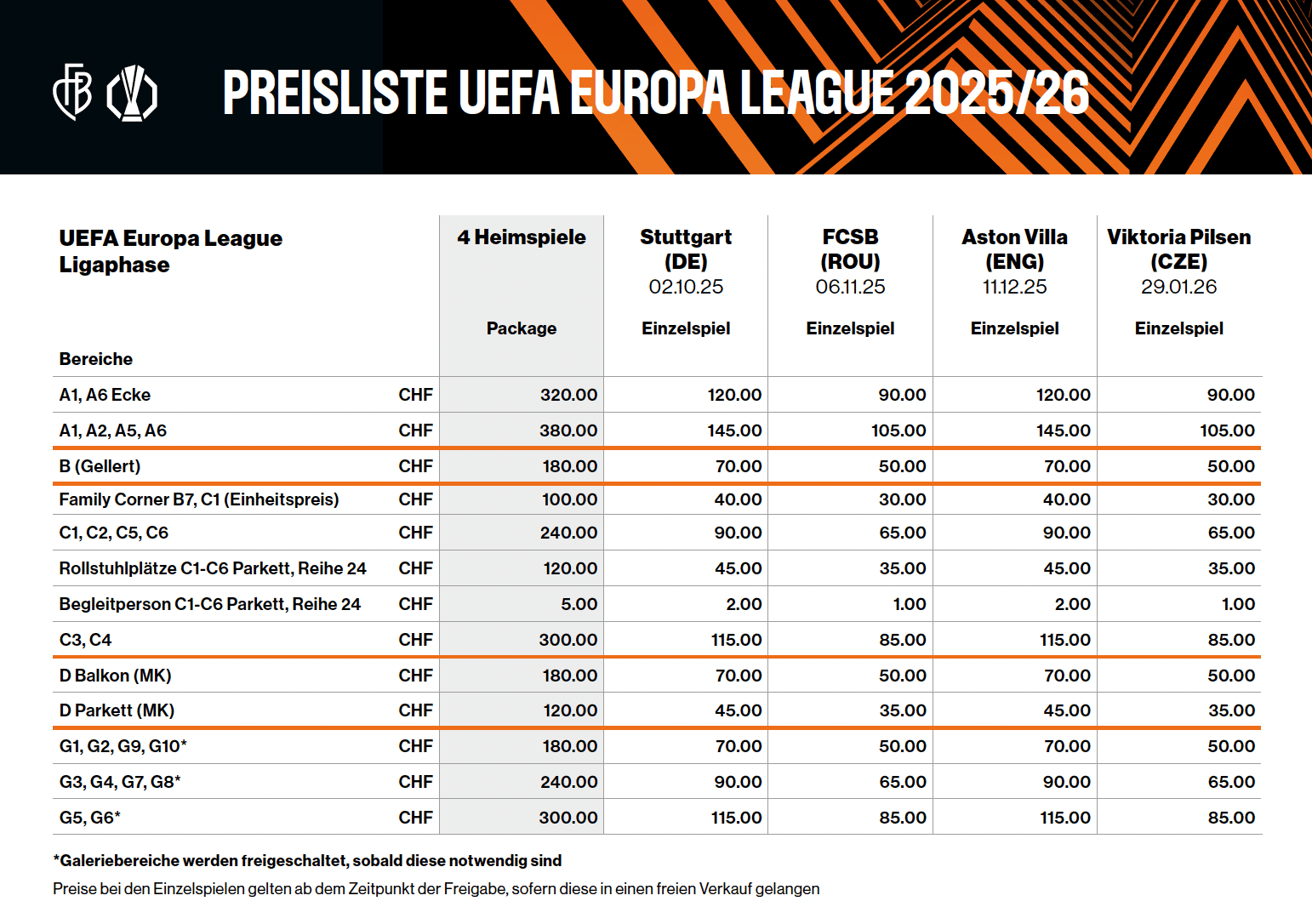 Nach fünf (zu) langen Jahren steht der FC Basel 1893 wieder in der Ligaphase der UEFA Europa League. Mit dem VfB Stuttgart, dem FCSB Bukarest, dem Aston Villa FC und dem FC Viktoria Pilsen empfängt der FCB hochkarätige Gegner im Joggeli. Das Ziel ist klar: Der Einzug in die K.o.-Phase im Februar 2026!